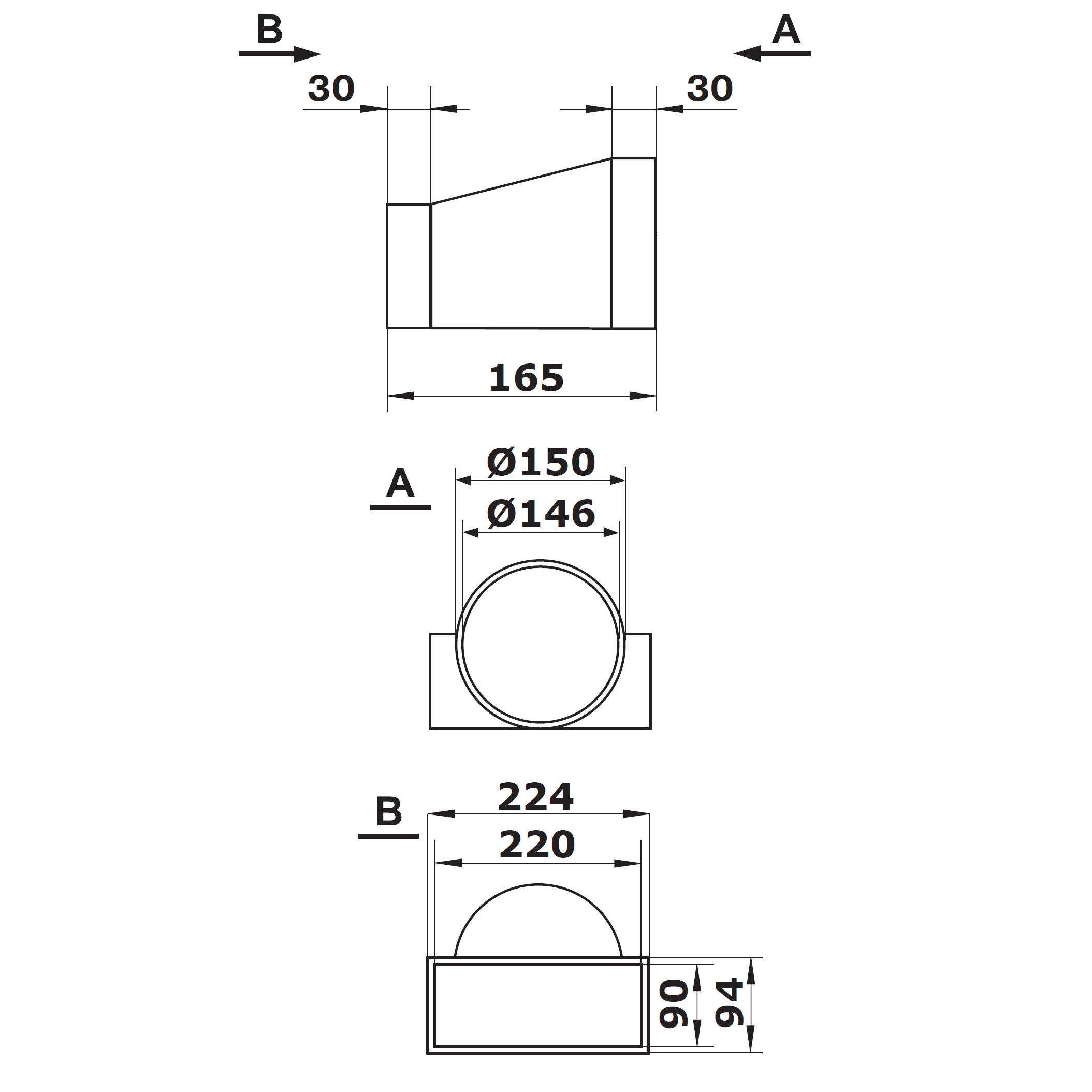Plastová redukce osová pro přechod z potrubí hranatého 220x90 mm na kruhové Ø 150 mm nebo obráceně.